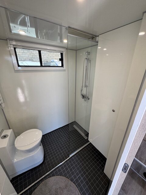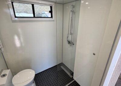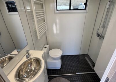 • Badezimmer mit Dusche, WC und Waschbecken sowie Schränken